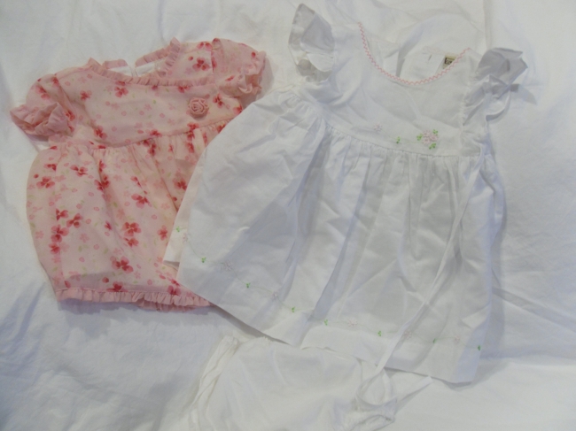 White dress w/ diaper cover by Chiara 9 monthsPink dress w/ floral pattern by koala baby 6-9 months