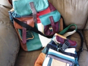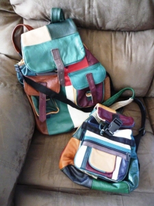 Multi-colored leather patchwork backpack set...Large 14" x 16" with extra side zipper for side access, two front pouches & zipper in flap and Small 10" x 11" with one front pouch & zipper compartment, and zipper in flap. Like new, barely used.