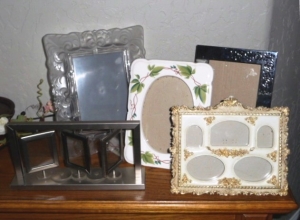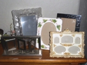 Five assorted picture frames (5x7 and smaller pix). Glass, ceramic, silver and gold gilded. All in very good condition.