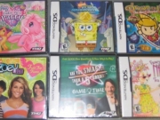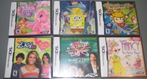 Assortment of games for Nintendo DS: SpongeBob's Atlantis Squarepants, Pinkie Pie's Party, Zoe 101: Field Trip Fiasco, Are You Smarter Than a 5th Grader?, Fancy Nancy Tea Party Time!, and Drown to Life: The Next Chapter