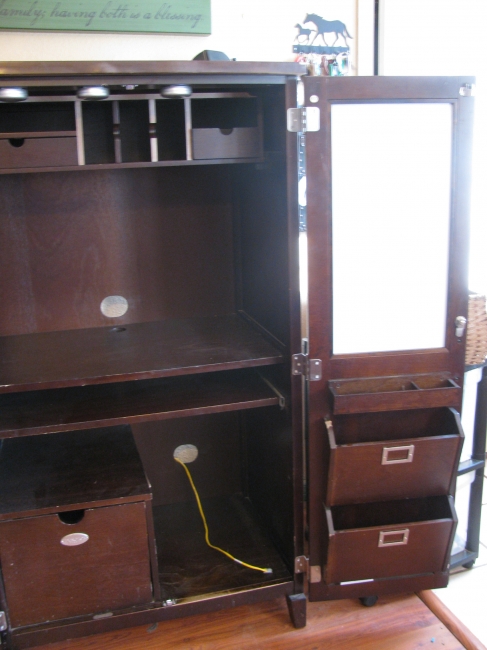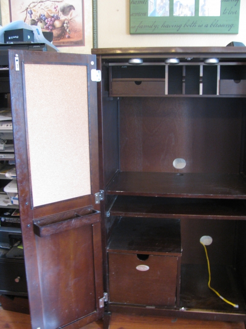 Computer armoire. file drawer, cubbies, dry erase board and file holders on inside right door, corkboard pencil tray on inside left door. finish needs some work. Free delivery in Sacramento area.