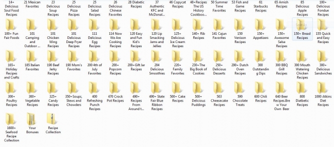I have collected over 16,320 of the best recipes for some of the worlds best foods and dishes. For example: 230+ cookie recipes, over 600 recipes for chili, 325 delicious candy recipes, secret copycat recipes, Amish cooking, easy kids recipes, awesome fair foods, over 1600 seafood recipes, desserts, main meals, diet and diabetic friendly dishes.. just to name a very few!