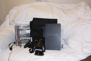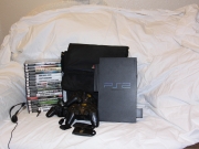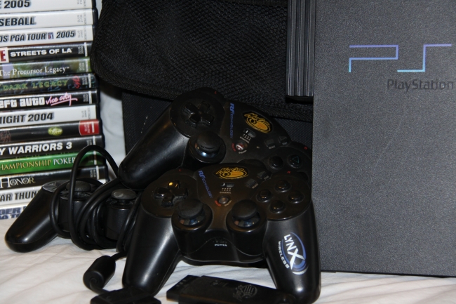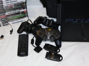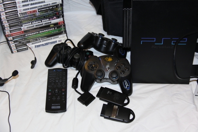 This is a PS2 with 1 wired remote, 2 wireless remotes, DVD Remote, Headset for online play and an official PlayStation Travel Case. Listed below are the game titles:Jak and Daxter: The Precursor LegacyGauntlet: Dark LegacyGrand Theft Auto: Vice CityFight Night 2004True Crime: Streets of LADevil May CryDynasty Warriors 3Socom: U.S. Navy SealsATV Offroad Fury 2Red Faction IIAgassi Tennis GenerationNBA Live 2005MVP BaseballTiger Woods PGA Tour 2001 & 2005World Championship PokerRise of HonorNascar Thunder 2004Some of these games are rated Mature 17+